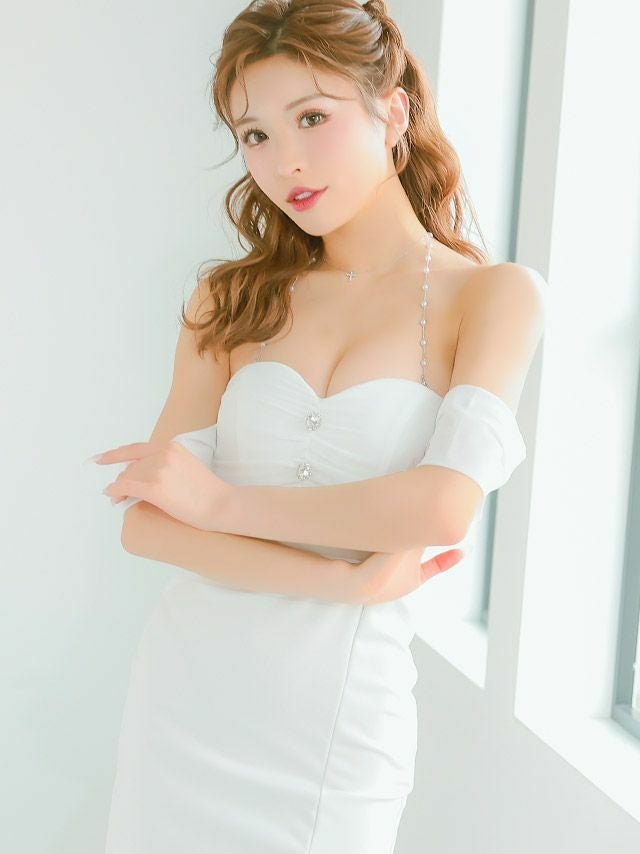 5. タイト ミニドレス 谷間 ストレッチ 肩出し 二の腕カバー シアー オフショルダー ハートカット サイドウエストベルト (聖菜着用) [Tika/ティカ]