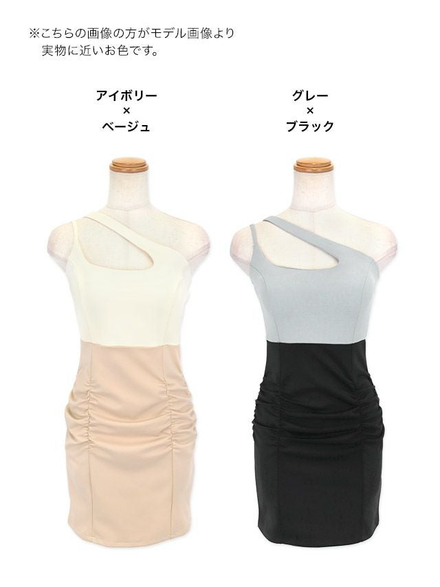 ワンショルダーカットアウトバイカラーギャザータイトミニドレス