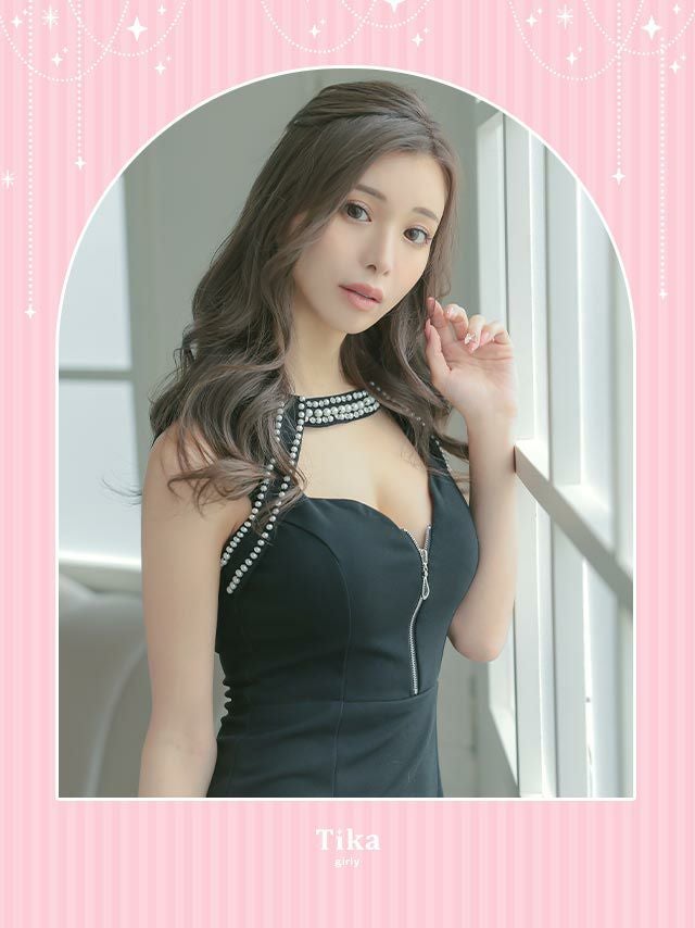 キャバドレス ミニ丈 キャバクラ クラブ ラウンジ ノースリーブ ネックバックリボン パール バストカット ジップ 谷間魅せ タイトミニドレス