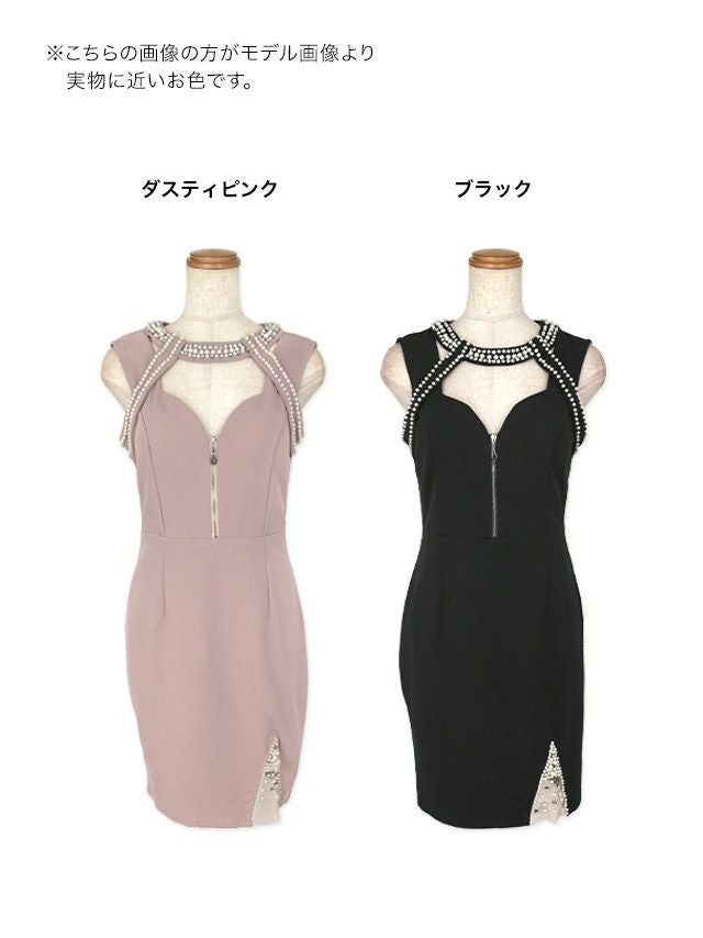 ノースリーブ パール バストカット ジップ 谷間魅せ タイトミニドレス