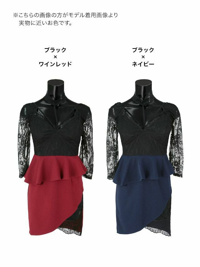 タイトミニドレス谷間大きいサイズブラックレースストレッチ袖あり七分袖ペプラムチョーカーバイカラーの商品画像1枚目