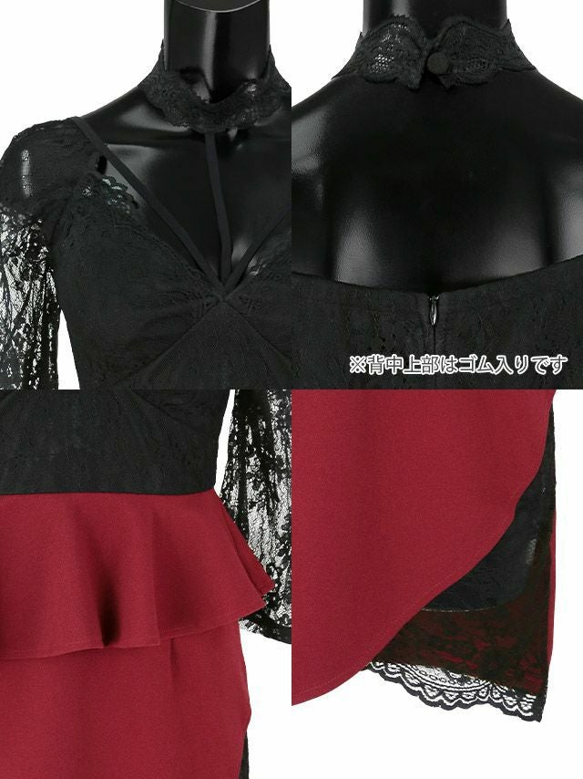 タイトミニドレス谷間大きいサイズブラックレースストレッチ袖あり七分袖ペプラムチョーカーバイカラーのサイドバック