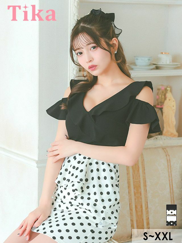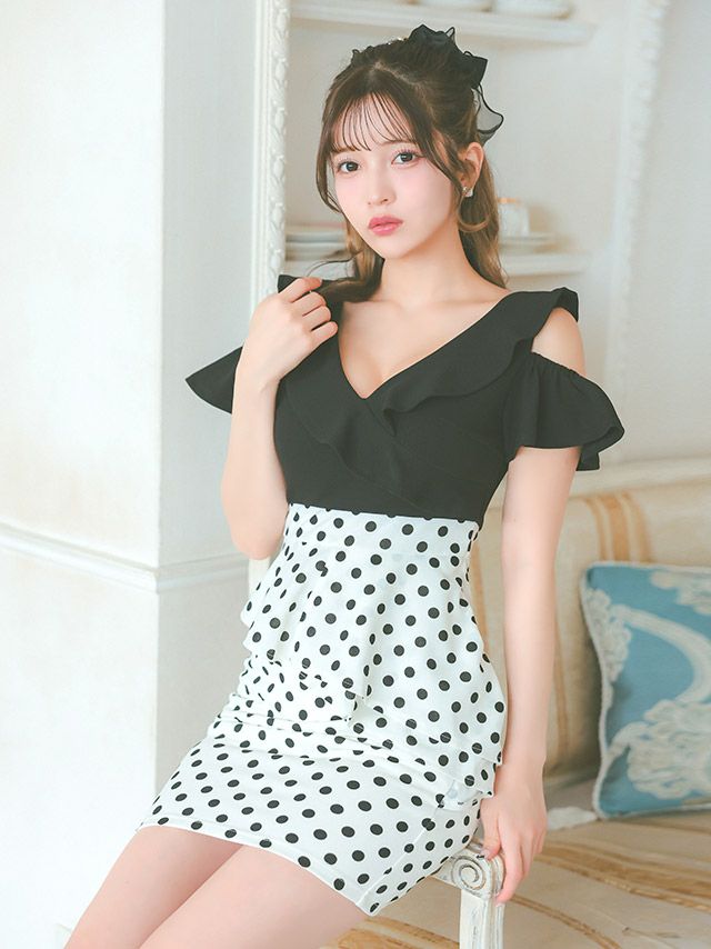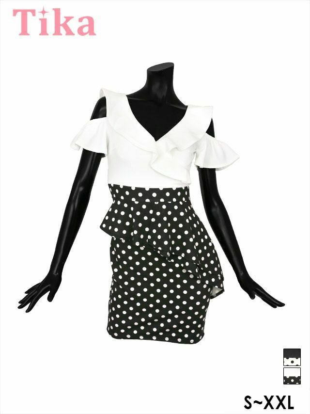 3. 肩あき 胸元フリル アシメペプラム 切り替え ドット柄 タイトミニドレス (Sサイズ~XXLサイズ) (黒嵜菜々子/キャバドレス着用) [Tika/ティカ]