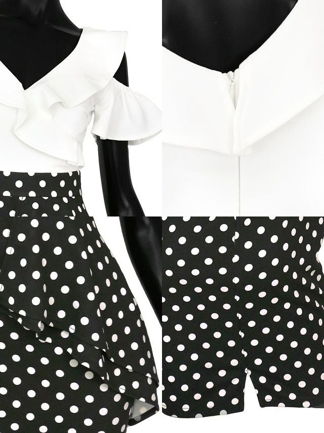 5. 肩あき 胸元フリル アシメペプラム 切り替え ドット柄 タイトミニドレス (Sサイズ~XXLサイズ) (黒嵜菜々子/キャバドレス着用) [Tika/ティカ]