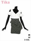 新作★大人可愛く着こなせるガーリードレス♪ 肩あき 胸元フリル アシメペプラム 切り替え ドット柄 タイトミニドレス (Sサイズ~XXLサイズ) (黒嵜菜々子/キャバドレス着用) [Tika/ティカ]