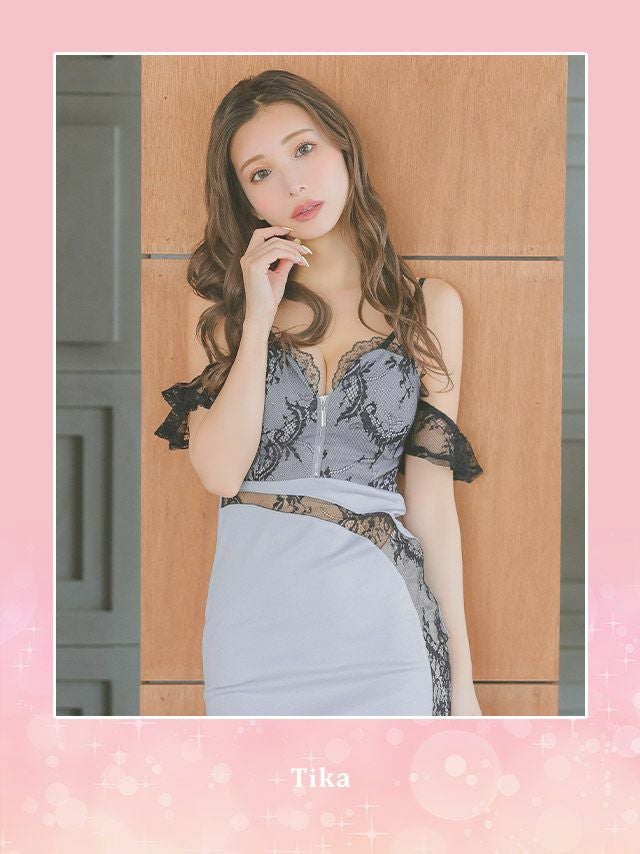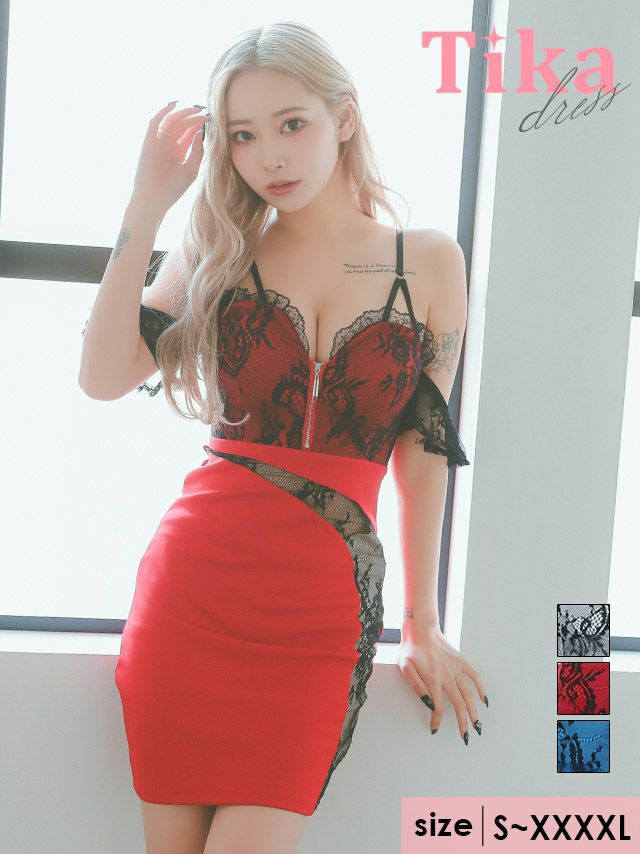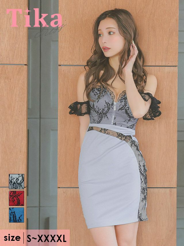 5. [アウトレット]肩あきフロントジップブラックレース切替タイトミニドレス (Sサイズ~XXXXLサイズ) (PyunA./キャバドレス着用) [Tika/ティカ]