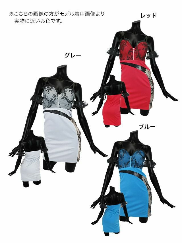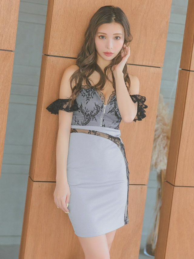 キャバドレス ミニ丈 キャバクラ クラブ ラウンジ 肩あき フロントジップ ブラック レース切替 タイトミニドレス