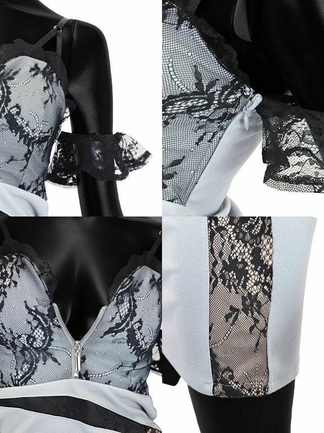 肩あきフロントジップブラックレース切替タイトミニドレスのディティール1枚目