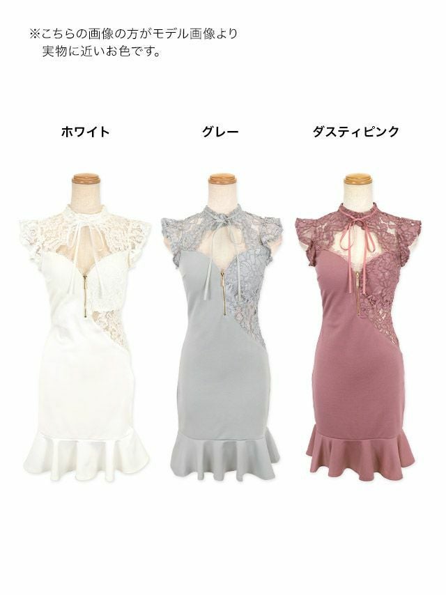キャバドレス ミニ丈 キャバクラ クラブ ラウンジ フリル袖 バストフロントジップ フラワーレース ノースリーブ タイトミニドレス
