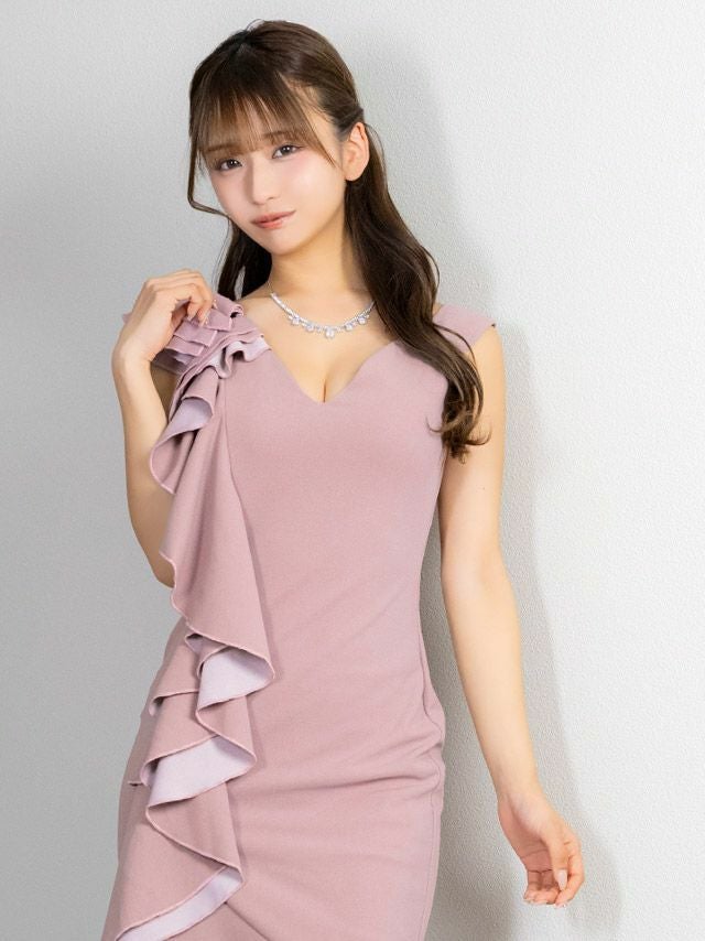 5. [アウトレット]ノースリーブ Vネック フリル袖 マーメイドテール 膝丈ドレス (Sサイズ~XXLサイズ) (森脇梨々夏/キャバドレス着用) [Tika/ティカ]