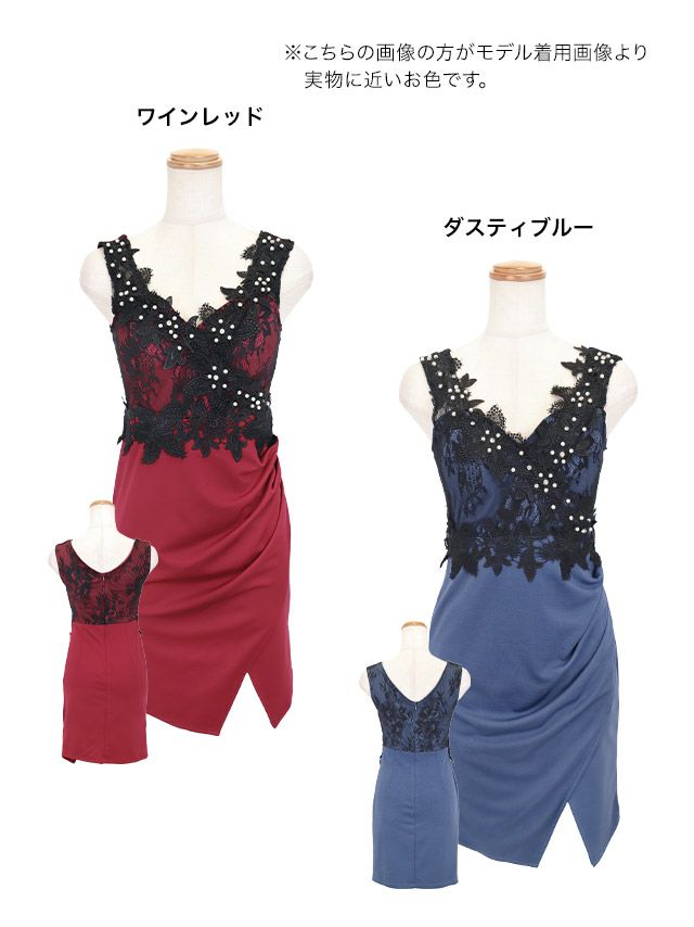 ノースリーブブラックフラワーレースパールビジュー切り替えラップギャザータイトミニドレスの商品画像4枚目