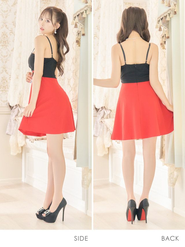 4. キャミソールカシュクールネック刺繍レースハイウエスト切替フレアミニドレス (Sサイズ~XXXLサイズ) (ゆんころ/キャバドレス着用)