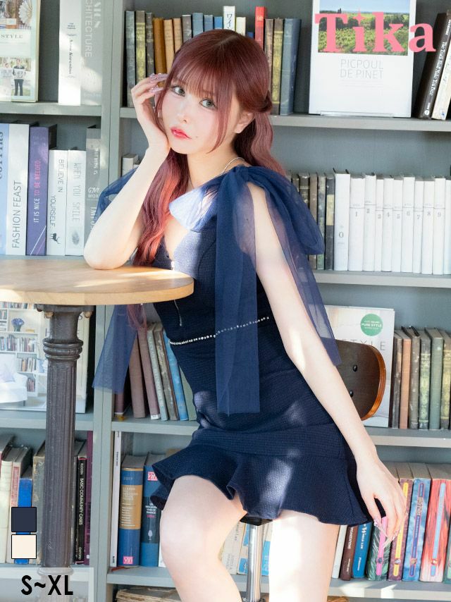 4. タイトミニドレス 谷間 ジップ ノースリーブ チュールリボン ツイード 裾フリル キャバドレス (黒崎みさ着用) [Tika/ティカ]