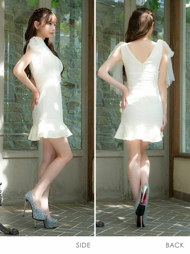 キャバドレス ミニ丈 キャバクラ クラブ ラウンジ タイトミニドレス 谷間 ジップ ノースリーブ チュールリボン ツイード 裾フリル キャバドレス