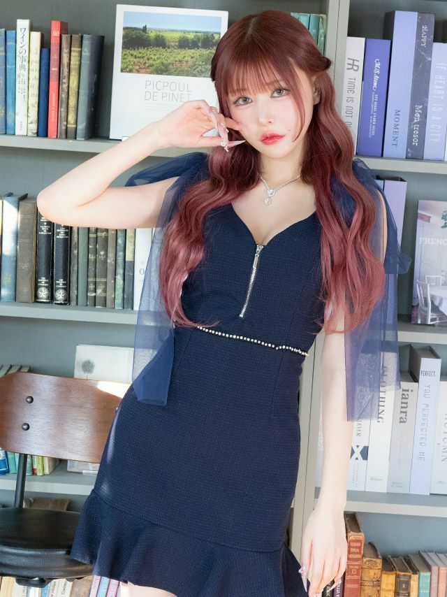 5. タイトミニドレス 谷間 ジップ ノースリーブ チュールリボン ツイード 裾フリル キャバドレス (黒崎みさ着用) [Tika/ティカ]