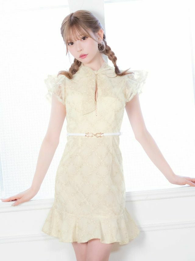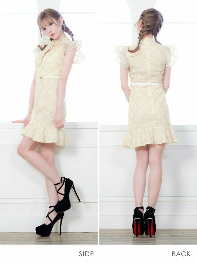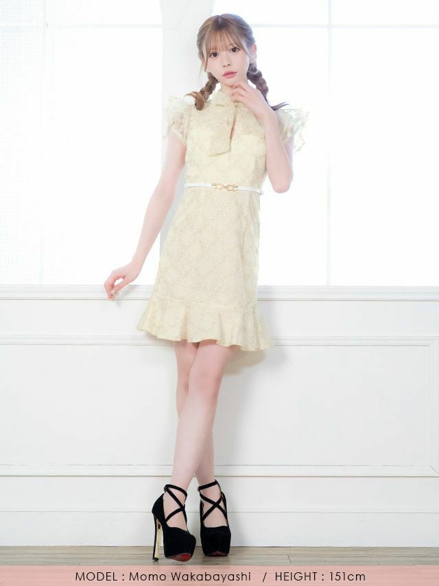キャバドレス ミニ丈 キャバクラ クラブ ラウンジ ウエストベルト付き バストジップ ノースリーブ ネックリボン フラワー刺繍 チェック柄 裾フリル タイトミニドレス