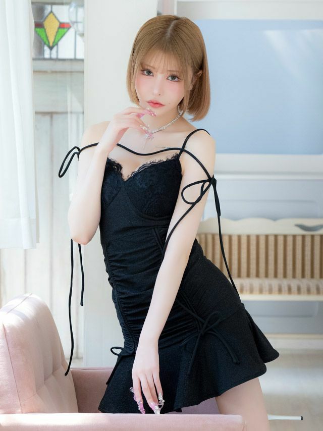 5. キャミソール コード レース 谷間見せ ドロストリボン 裾フリル ラメ タイトミニドレス (Sサイズ~Lサイズ) (重川茉弥/キャバドレス着用) [Tika/ティカ]