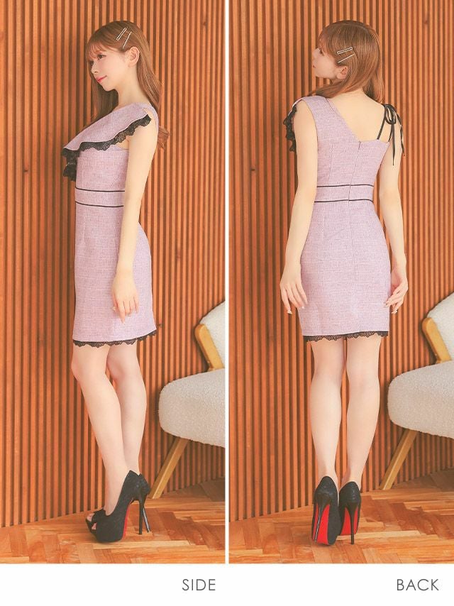 タイトミニドレスレース上品ツイードアシメショルダーパイピング胸元フリルのサイドバック