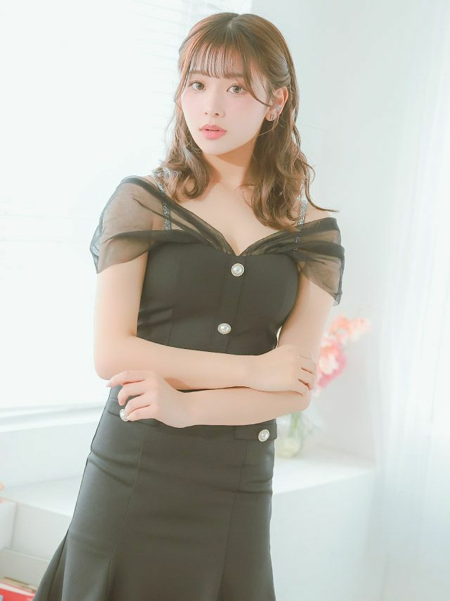 [アウトレット] シアー ラメショルダー パールボタン セットアップ ストレッチ 肩あき フレアミニドレス (Sサイズ~Lサイズ) (上ノ堀結愛/キャバドレス着用)[Tika/ティカ]