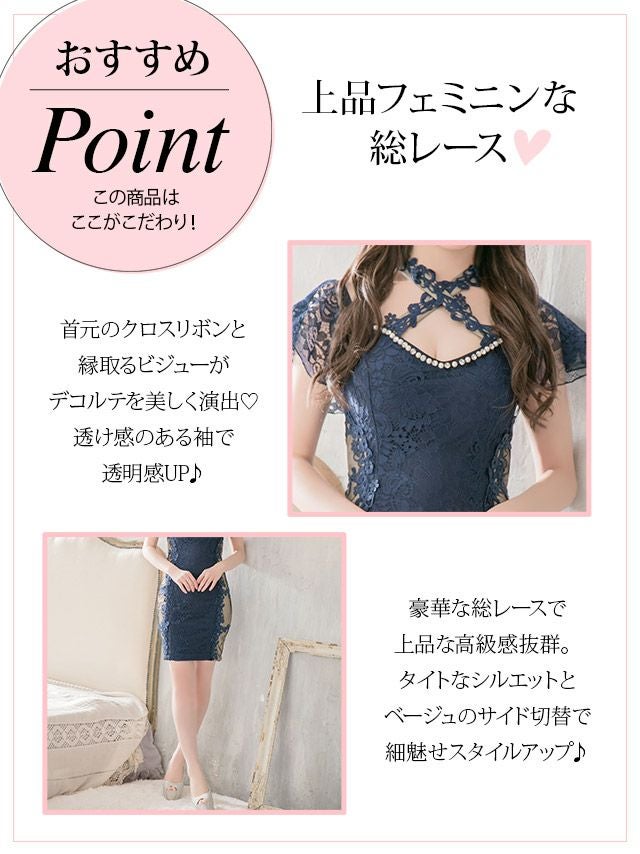 クロスネックフレスリーブサイドシースルー切り替え×総レースタイトミニ半袖ドレス