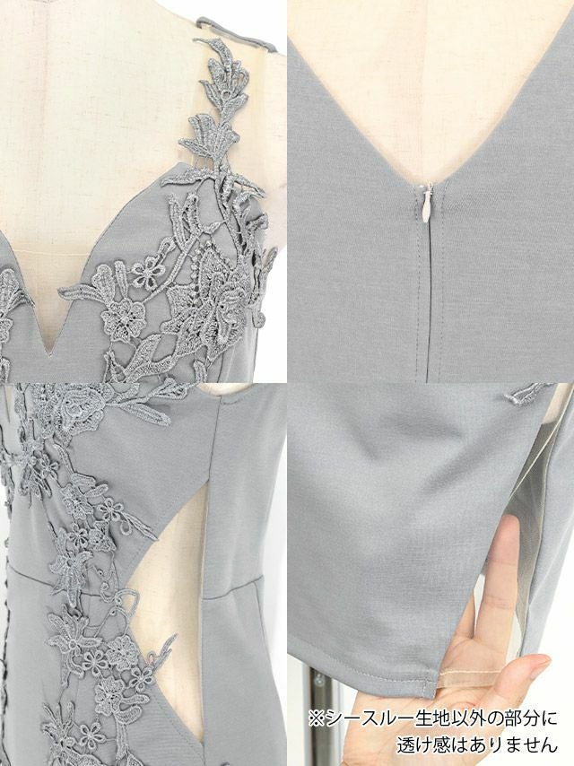 ノースリーブバストシースルー谷間見せ立体フラワー刺繍ヌーディーシアーくびれストレッチタイトミニドレス