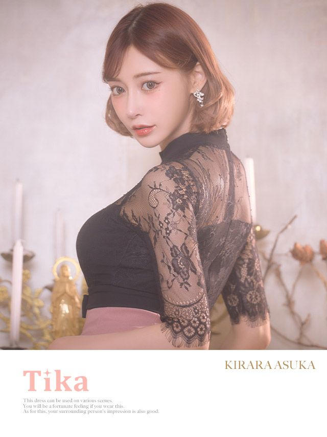 3. ハイネックブラックフラワーレースウエストリボン袖ありタイト膝丈ドレス (Sサイズ~XXLサイズ) (久保七瀬/キャバドレス着用)