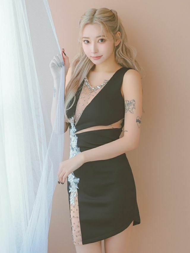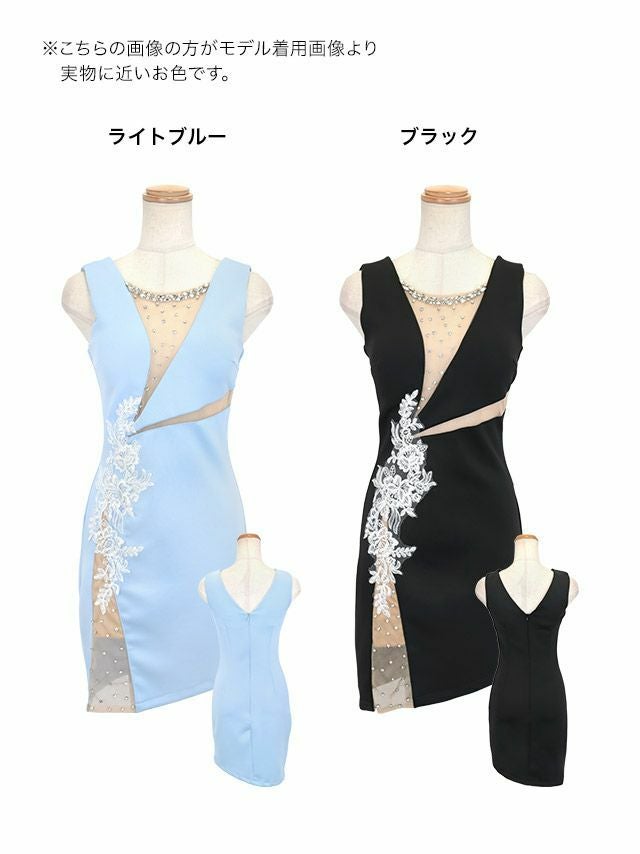 キャバドレス ミニ丈 キャバクラ クラブ ラウンジ ノースリーブ ヌーディーシアーストーン バストシースルー 刺繍 アシメ 谷間魅せ タイトミニドレス