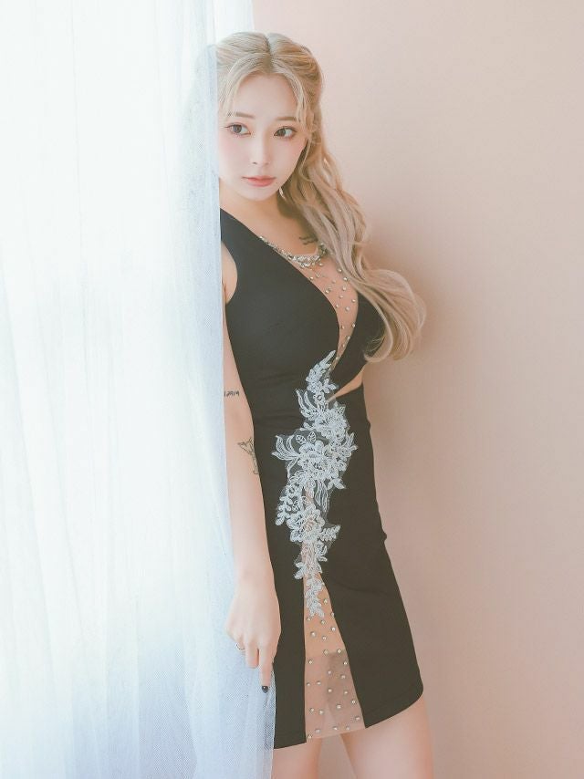 3. ノースリーブ ヌーディーシアーストーン バストシースルー 刺繍 アシメ 谷間魅せ タイトミニドレス (Sサイズ~Lサイズ) (PyunA./キャバドレス着用) [Tika/ティカ]