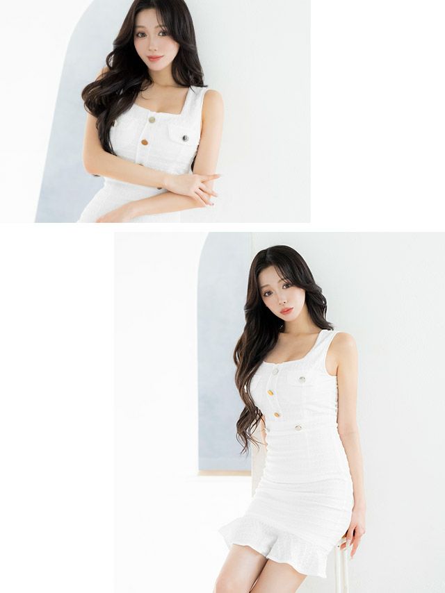 5. [アウトレット]ノースリーブワッフルゴールドボタンワンカラー裾フリルタイトミニドレス(Sサイズ~XLサイズ) (せいせい/キャバドレス着用) [Tika/ティカ]