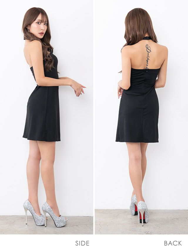 ホルターネックリボンワンカラーシンプルタイトミニドレスのサイドバック