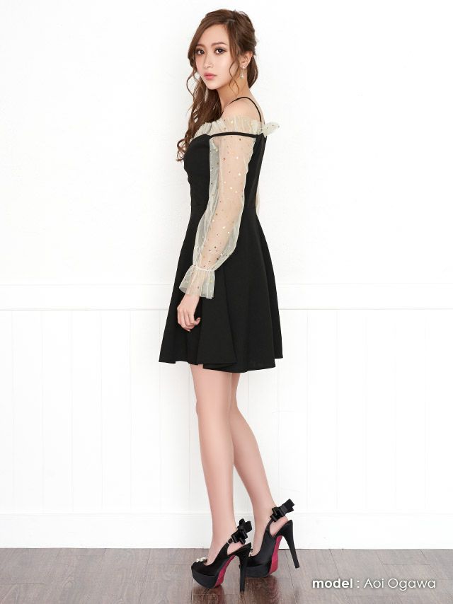 5. [SALE]オープンショルダースタースパンコール長袖シアーチュールプチプラフレアミニドレス (Mサイズ)(小川真葵/キャバドレス着用)[myMinette/マイミネット]