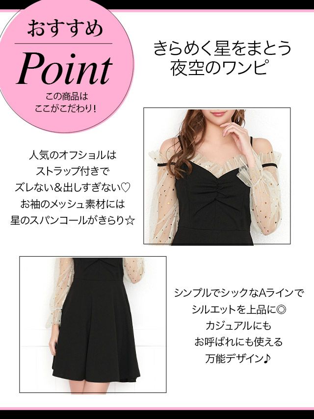 キャバドレス 安い 激安 ミニ丈 キャバクラ クラブ ラウンジ オープン ショルダー スター スパンコール 長袖 シアー チュール aライン ミニドレス プチプラドレス
