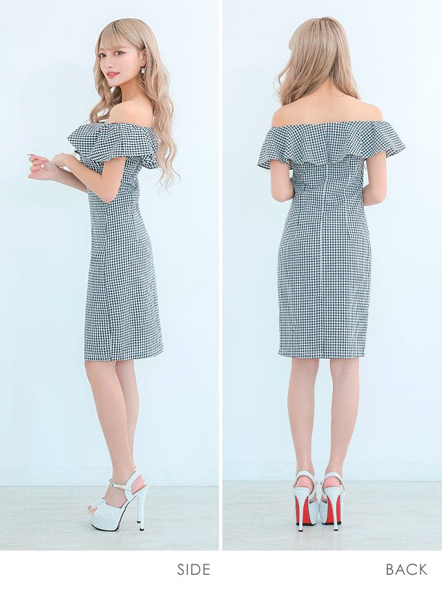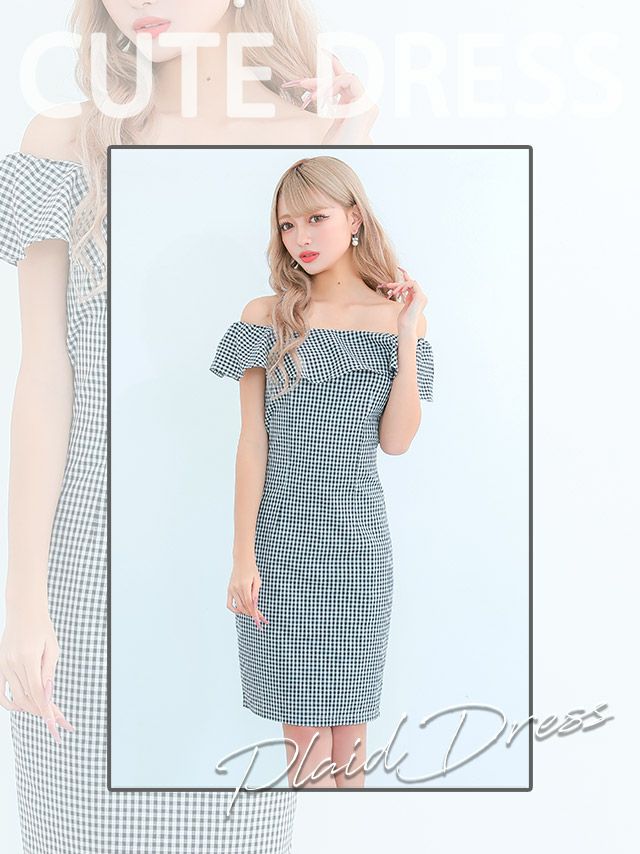 5. [SALE]ギンガムチェック柄フリルオフショルダープチプラタイトミニドレス (Sサイズ~Lサイズ) (林姫奈妙/キャバドレス着用)[myMinette/マイミネット]