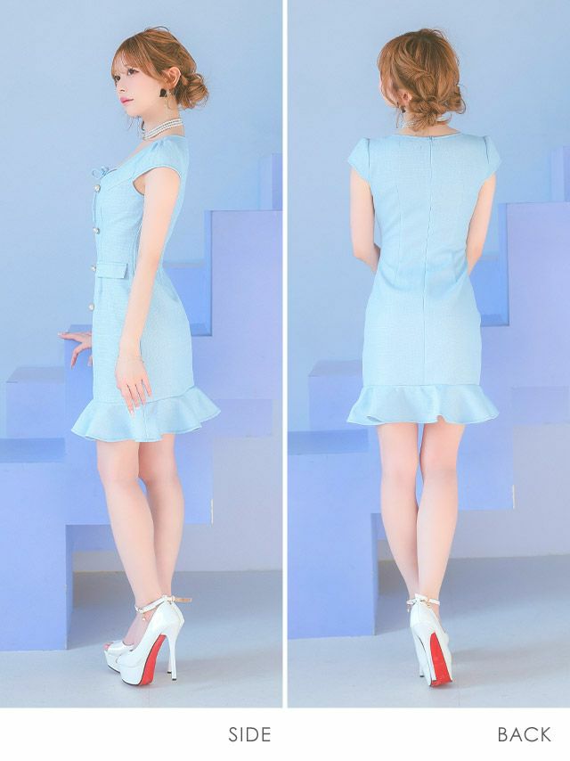 キャバドレス ミニ丈 キャバクラ クラブ ラウンジ ワンピース タイト ミニドレス 谷間 大きいサイズ シンプル 大人 上品 ツイード 半袖 ブラジャーのまま デコルテリボン ダブルパールボタン 裾フリル