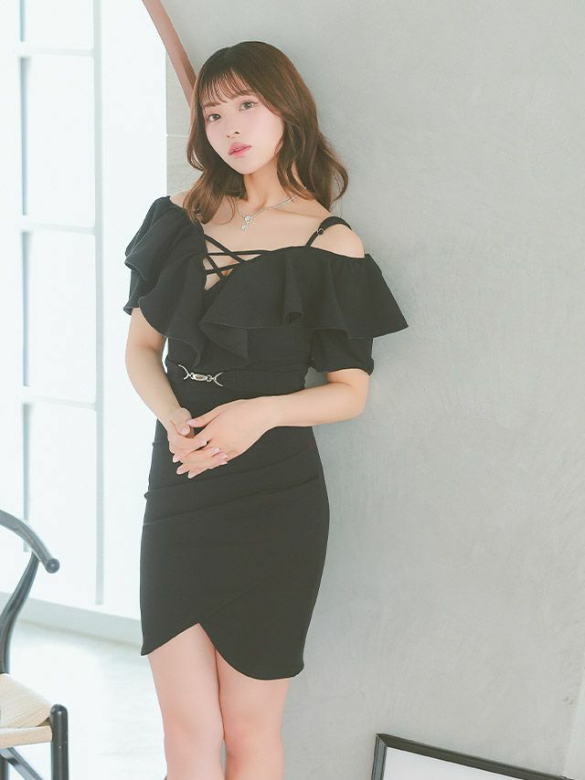 キャバドレス ミニ丈 キャバクラ クラブ ラウンジ ウエストベルト付き 肩あき ワンカラー 胸元フリル 谷間見せ バストクロスデザイン ラップ タイトミニドレス