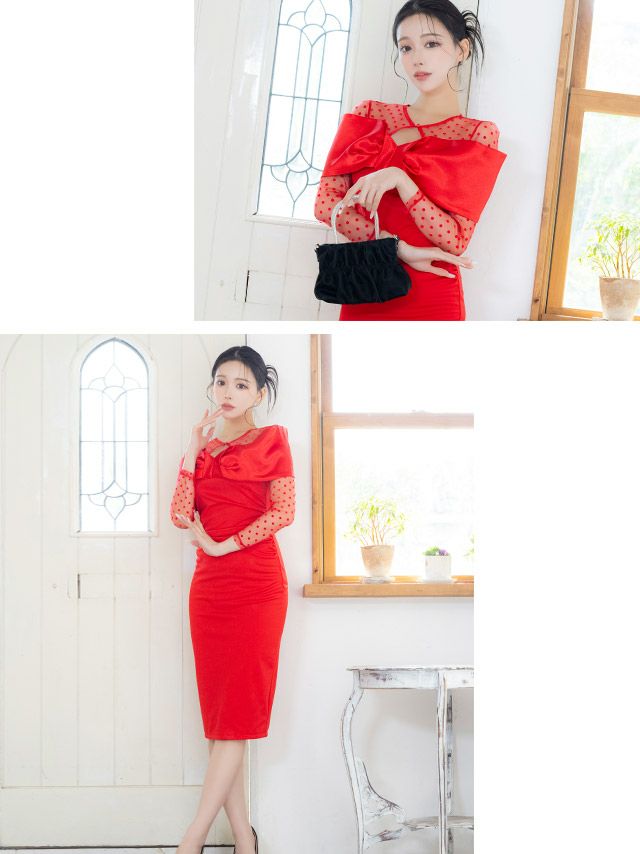 5. [アウトレット]ワンカラーシアードット柄長袖バストビッグリボンタイト膝丈ドレス (Sサイズ~XLサイズ) (せいせい/キャバドレス着用) [Tika/ティカ]