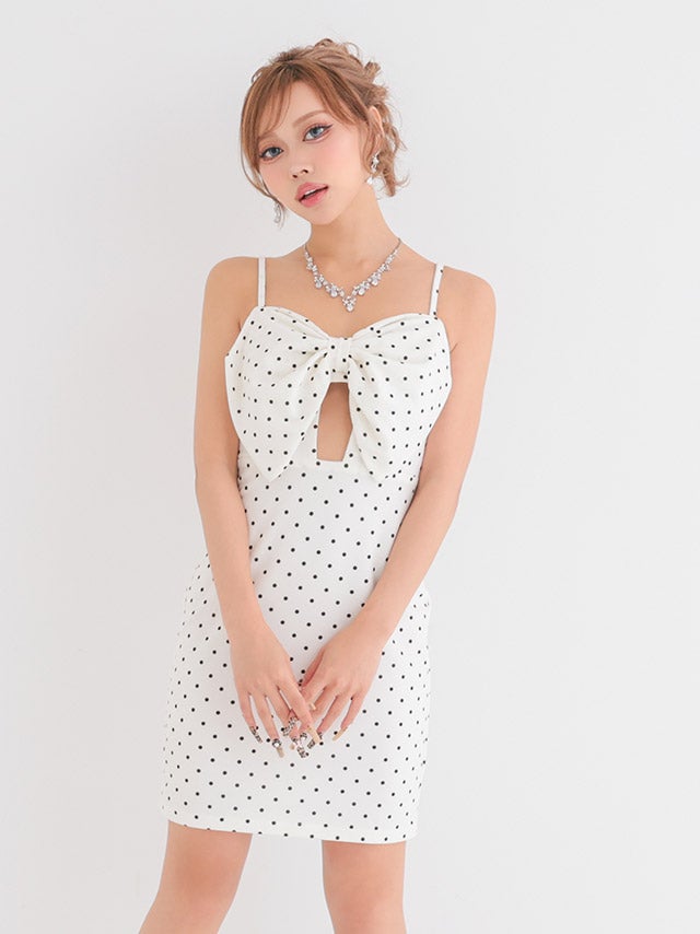 [新作] ミニドレス プチプラ ギャル タイト セクシー キャミソール ドット柄 低身長 谷間 背中魅せ リボン ガーリー 黒 キャバドレス (あん着用/S~Lサイズ対応) | myMintette/マイミネット