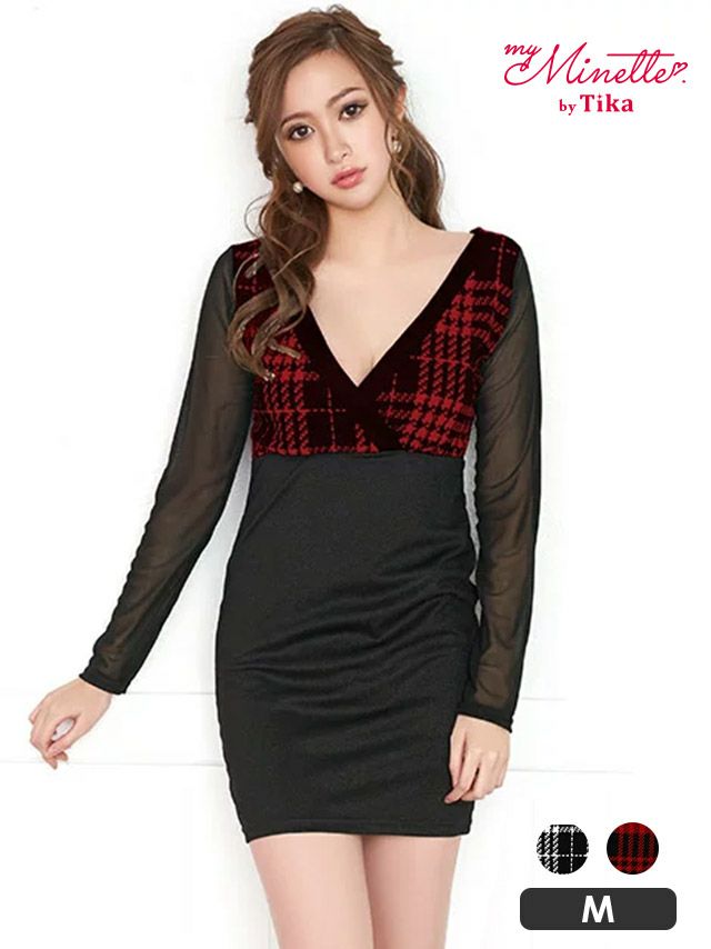 バイカラー袖シースルー長袖タイトミニドレスカラーバリエーション