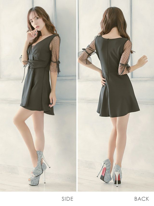 キャバドレス 安い 激安 ミニ丈 キャバクラ クラブ ラウンジ 胸元 シースルー 水玉柄 Aライン フレアドレス プチプラドレス