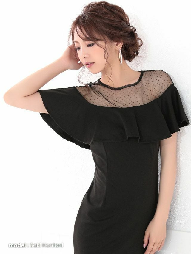 キャバドレス 安い 激安 ミニ丈 キャバクラ クラブ ラウンジ オフショル 風 フリル シアー ネック ドット柄 タイト ミニ フィッシュテールドレス プチプラドレス