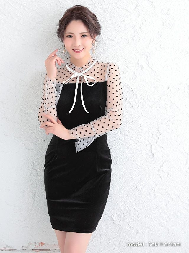 5. 長袖ドット柄チュール丈タイトワンピースプチプラミニドレス (Mサイズ)(本谷紗己/キャバドレス着用)[myMinette/マイミネット]