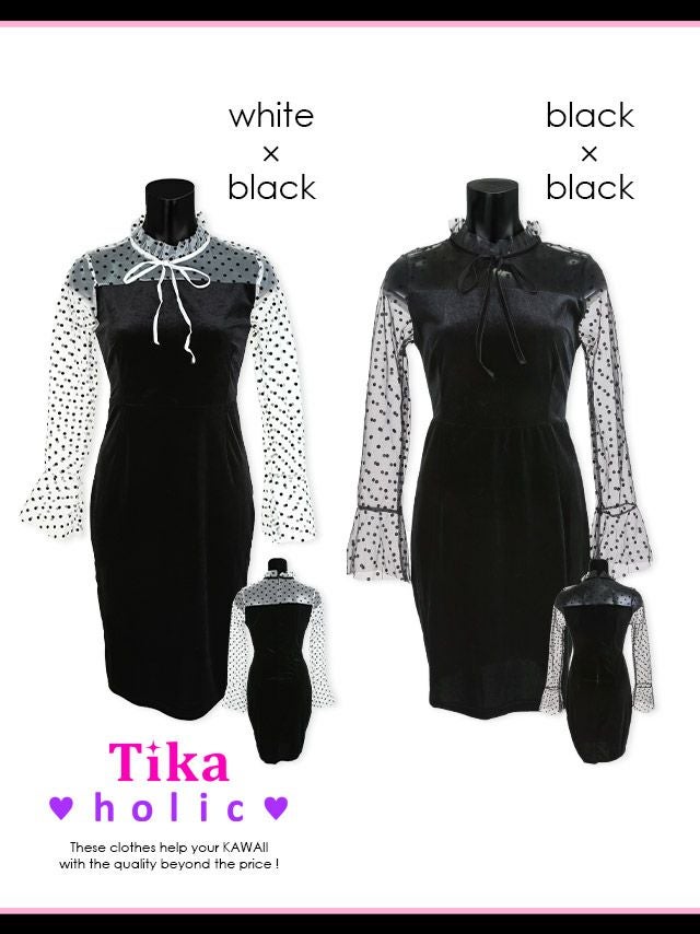 長袖ドットチュールミニ丈タイトワンピースドレスカラーバリエーション