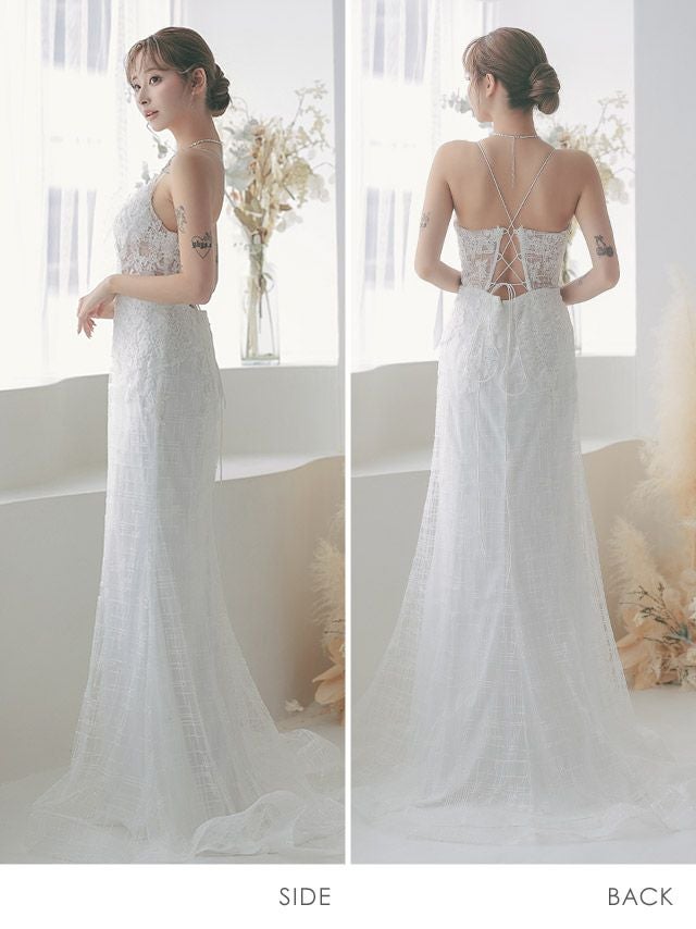 レースアップデザインラメチェックマーメイドロングドレス