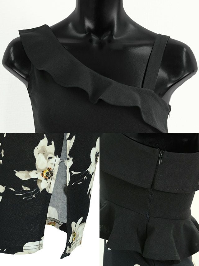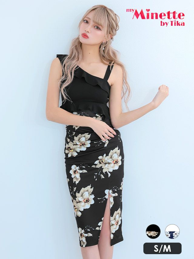 5. [SALE]大柄フラワーフリルワンショルダーバイカラータイトプチプラ膝丈ドレス (Sサイズ/Mサイズ)(向葵まる/キャバドレス着用)[myMinette/マイミネット]