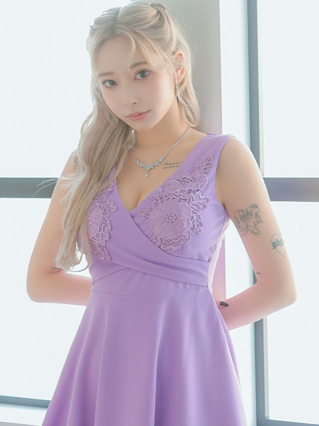 キャバドレス 安い 激安 ミニ丈 キャバクラ クラブ ラウンジ Vネック ノースリーブ フラワー 刺繍 ワンカラー フレアミニドレス プチプラドレス