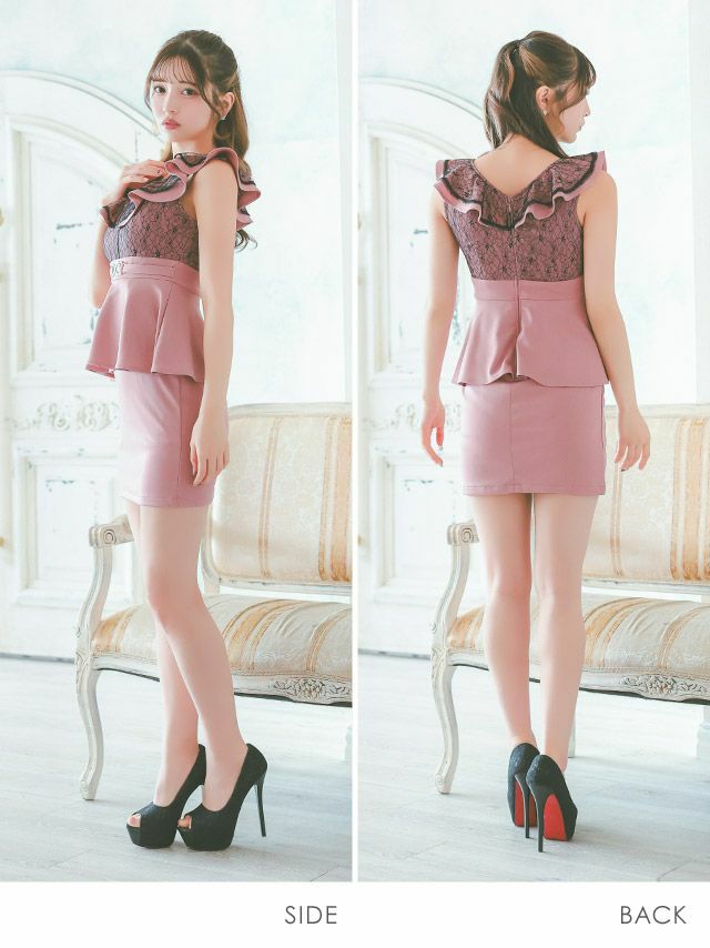 キャバドレス ミニ丈 キャバクラ クラブ ラウンジ ノースリーブ 大判 フリル袖 ブラックフラワーレース 切り替え ウエストベルト ペプラム ストレッチ タイトミニドレス