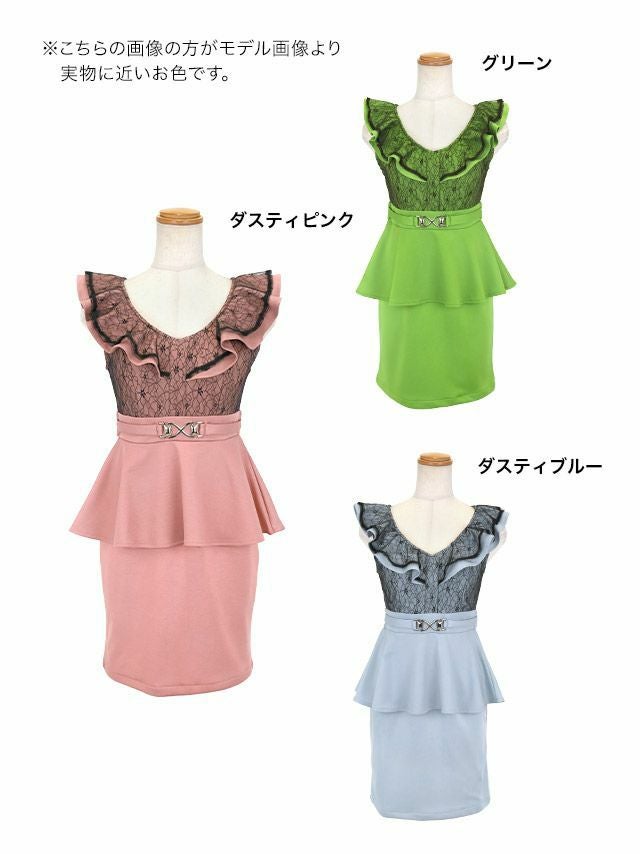 ノースリーブ大判フリル袖ブラックフラワーレース切り替えウエストベルトペプラムストレッチタイトミニドレスのカラー
