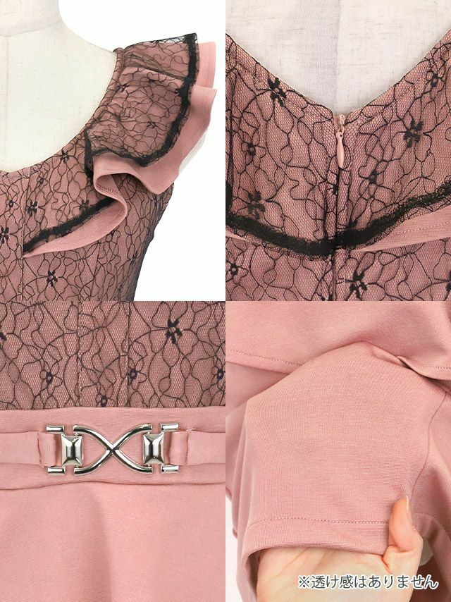 ノースリーブ大判フリル袖ブラックフラワーレース切り替えウエストベルトペプラムストレッチタイトミニドレスの商品画像3枚目