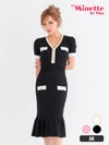 半袖 バイカラー配色 Vネック パールボタン付き マーメイド 膝丈ドレスの商品画像