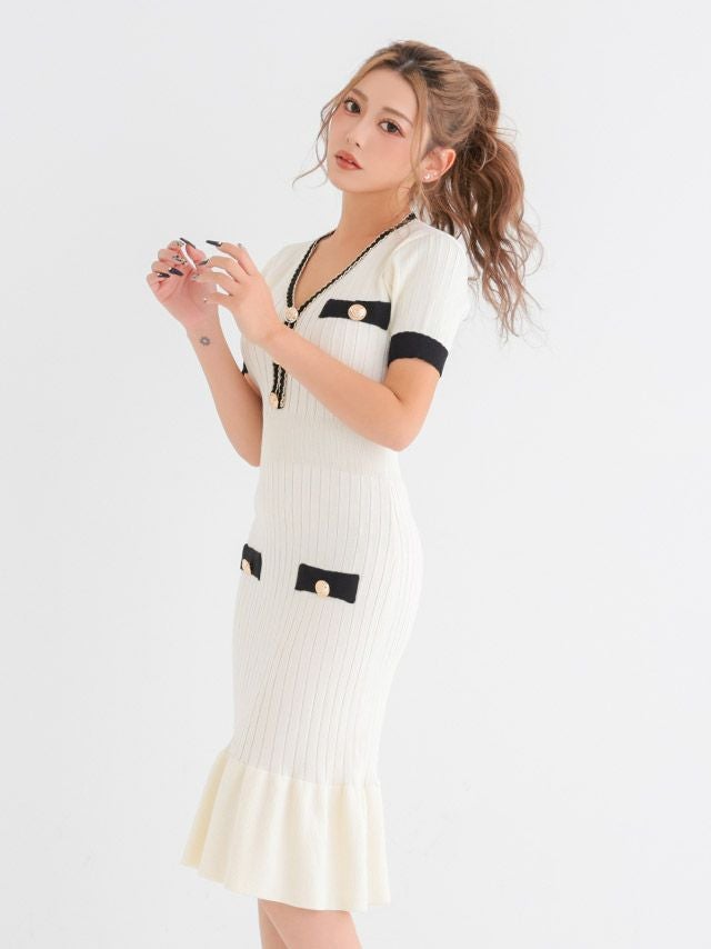 半袖 バイカラー配色 Vネック パールボタン付き マーメイド 膝丈ドレス